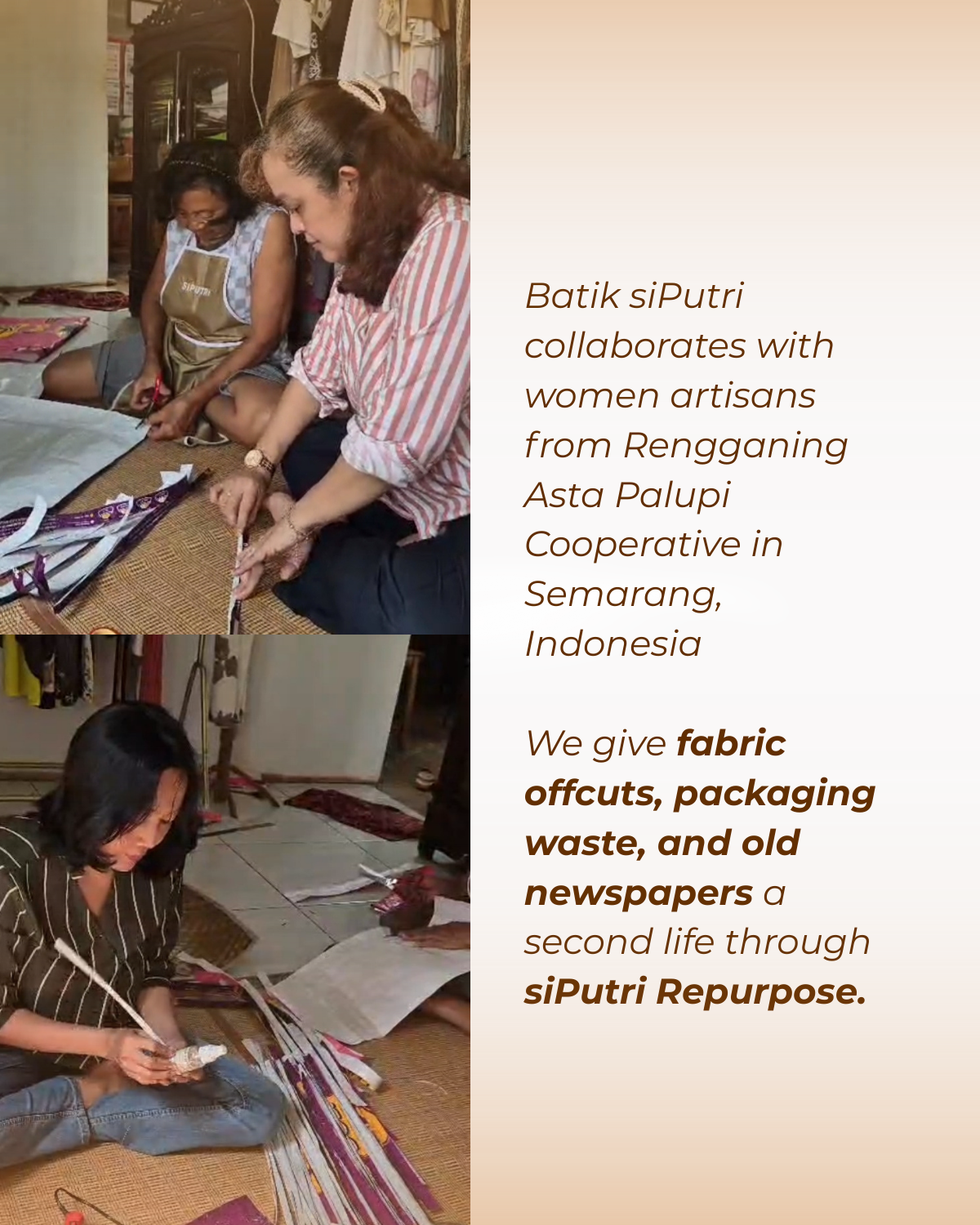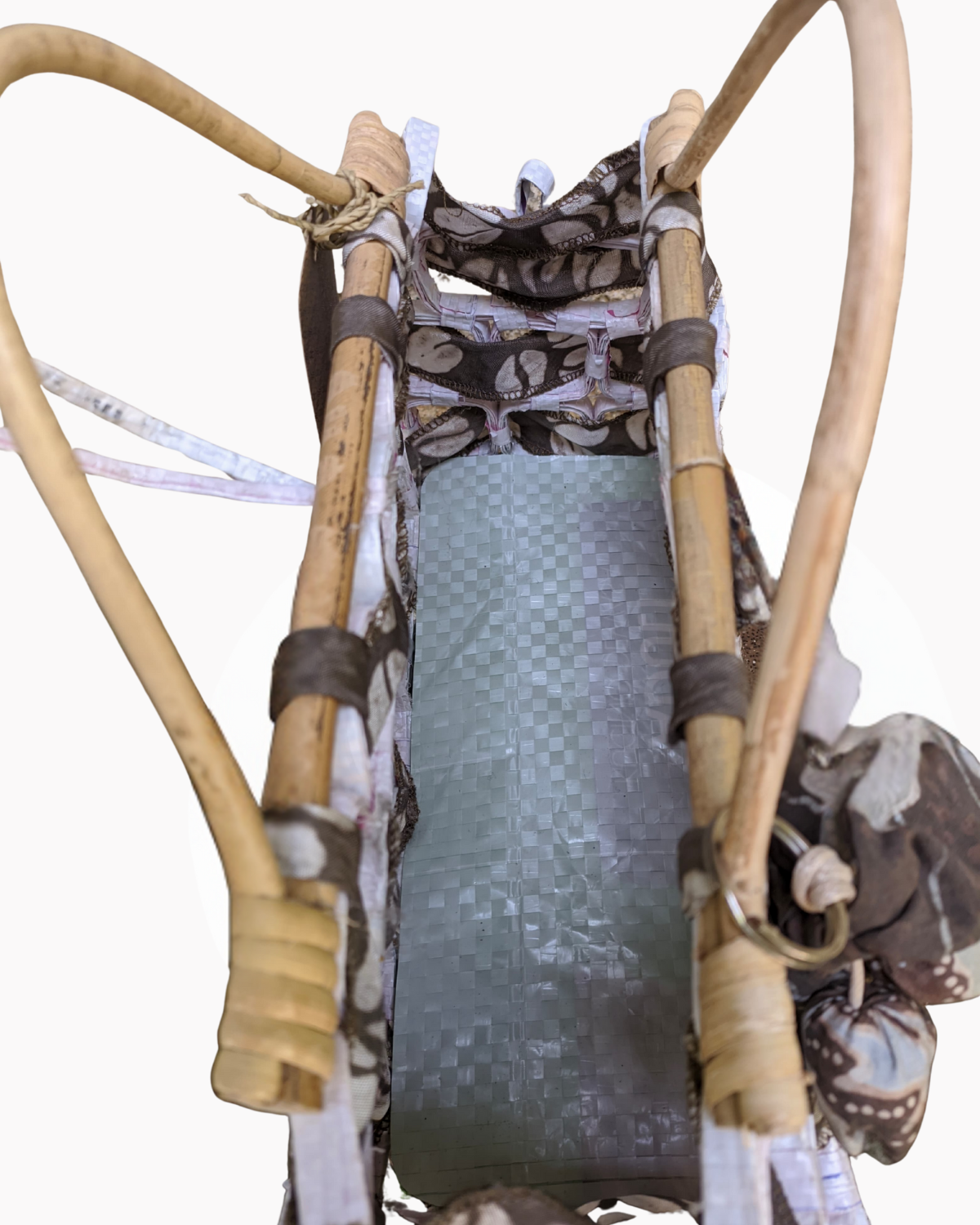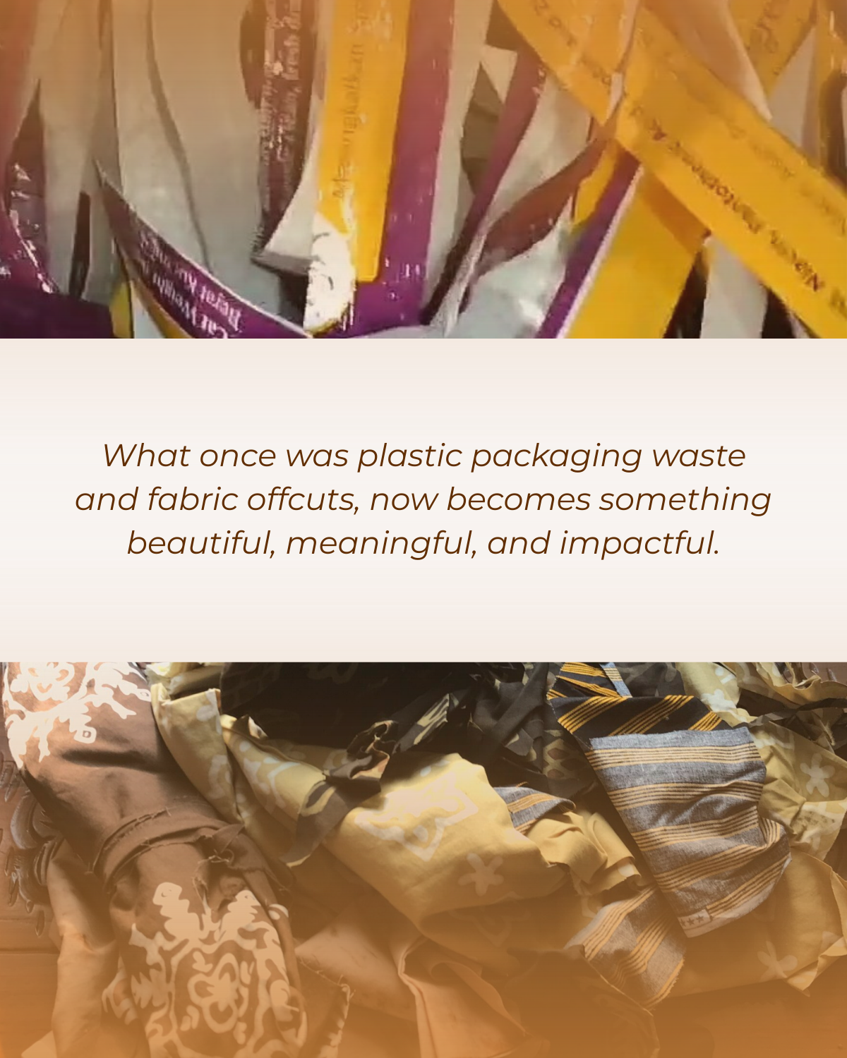 Material: fabric offcuts, plastic packaging waste, pegangan bambu